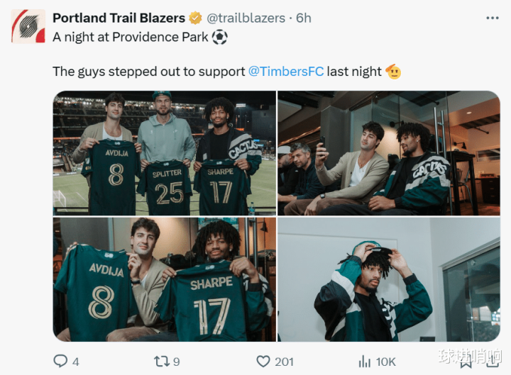 从开拓者官方发布的内容也能看出这一点,主帅斯普利特和主将夏普、阿夫迪亚一同去观看了足球比赛。